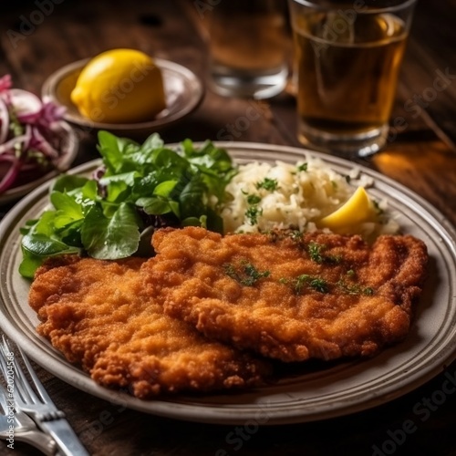schnitzel, plate, fried, closeup, pork meat, breaded, lemon, fresh, escalope, austrian, cookery, dinner, meal, delicious, slice, spiced, herb, roasted, parsley, sirloin, portion, tasty, fillet, epicure, cooked, german, vienna, food, meat, chop, defocused, crumb, cutlet, viennese, wiener, dish, eatery, table, warm, steak, bread, veal, lunch, chicken, generative