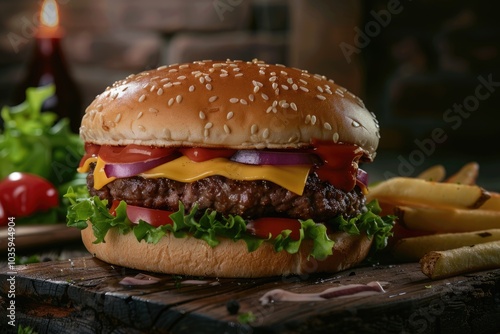 Homemade cheeseburger with cheese and vegetables served with french fries and salad burger