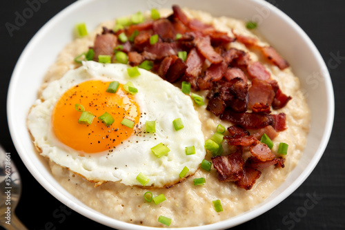 Homemade Cheesy Bacon Savory Oatmeal Bowl on a black background, side view. Close-up.