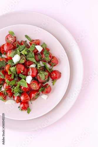 Homemade cherry tomato salad with fresh onions, mint, olive oil and salt
