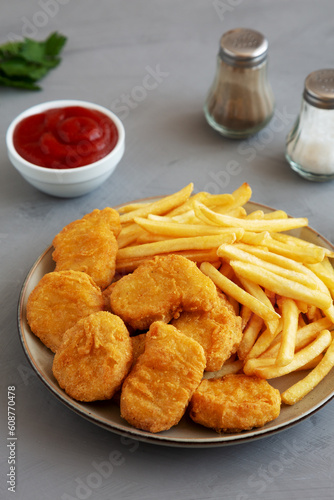 Homemade Chicken Nuggets and French Fries with Ketchup on gray background, side view.