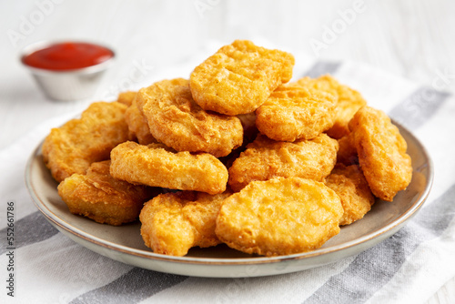 nugget, crunchy, crispy, cooked, chicken, background, american, lunch, ketchup, gold, fried, fresh, food, fat, fast food, fast food, fast, eat, dinner, delicious, unhealthy, tasty, snack, sauce, poultry, nugget, meat, meal, plate, white, wood, wooden, half face