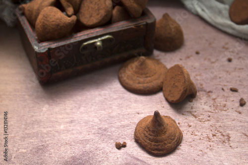 truffle, chocolate, cocoa, hot drink, sugar, oil, butter, candy, dessert, sweetness, closeup, texture, brown, food, tablecloth, clothes, gauze, wooden, kitchen, crumb, crumbly, wallpaper, sweet tooth