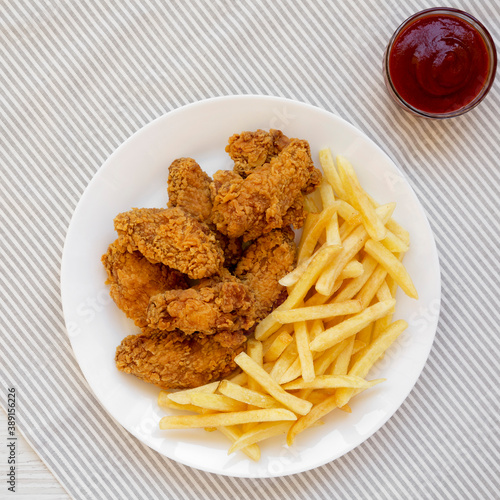 Homemade Crispy Chicken Wings and French Fries with ketchup, overhead view. Top view, from above, flat lay.
