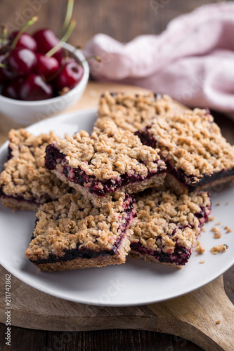 Homemade crumble bars with cherries on rustic wooden background, copy space