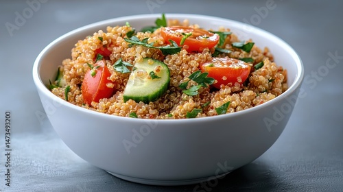 Homemade Food Concept, A vibrant quinoa salad with fresh vegetables garnished with herbs, served in a stylish white bowl.