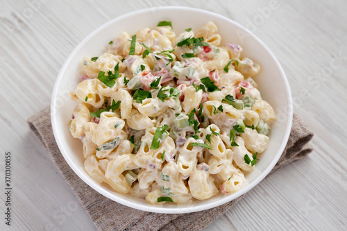 Homemade Macaroni Salad in a white bowl on a white wooden background, side view. Close-up.