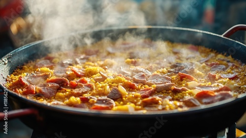 Homemade paella cooking in a traditional pan featuring meat seafood and vegetables with steam rising in an outdoor catering setting
