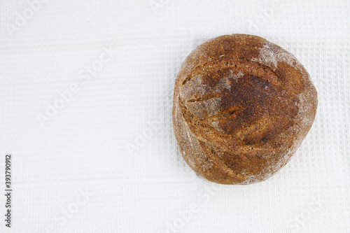 Homemade rye wheat sourdough bread with a crisp crust on a moneycomb towel background. Flat lay. Copy space
