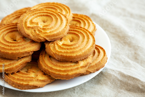 Homemade Sprits Biscuits on a Plate, side view. Space for text.