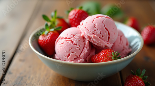 strawberry, ice cream, dessert, sweet, glacé, homemade, refreshing, creamy, fruit, cold, snack, pink, scoop, bowl, wooden table, natural, dairy, delicious, fresh
