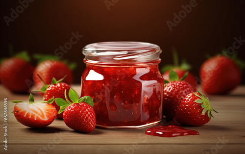 Homemade Strawberry Preserves or Jam in a Mason Jar Surrounded By Fresh Organic Strawberries Selective Focus with Blurred Foreground and Background