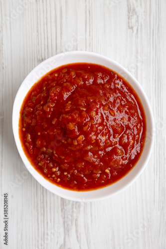 Homemade Tomato Salsa on a white wooden background, top view. Flat lay, overhead, from above.