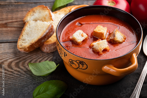 Homemade tomato soup with Basil, toast and olive oil on a wooden table. Prepared a vegetarian dish on a dark background