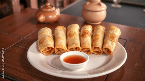 Homemade Traditional Style Chinese Egg Rolls with Red Dipping Sauce