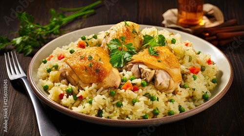 Homemade White Meat Chicken Rice Casserole Dish. Deliciously Handcrafted Casserole Recipe for Perfect Lunch or Dinner Meal