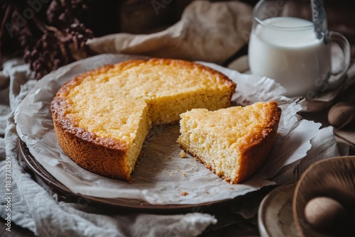 Homemade yellow honey cornbread on parchment with a slice on a plate and milk