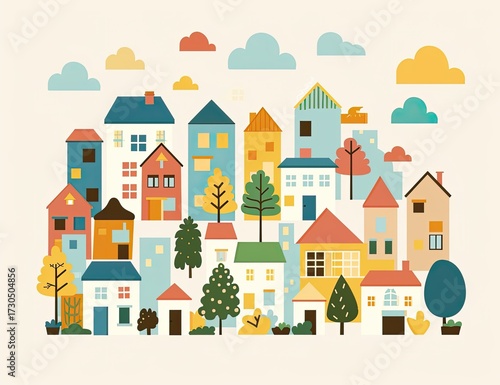 house, town, illustration, architecture, real, estate, cartoon, city, landscape, home, building, design, urban, community, style, colourful, flat, vector, cute, background, art, pattern, tree, nature, house, exterior, scenery, residential, modern, drawing, geometric, sky, cloud, graphic, abstract, district, property, country, village, family, row house, habitat, ecology, location, facades, neighbourhood, structure, dwelling