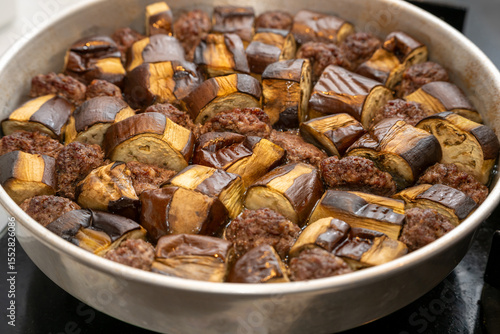 Homestyle eggplant and meatball stew cooked in a metal pot
