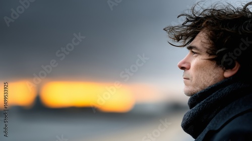 Homme contemplatif au coucher de soleil avec cheveux au vent