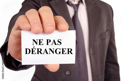 Homme tenant une carte sur laquelle est écrit ne pas déranger