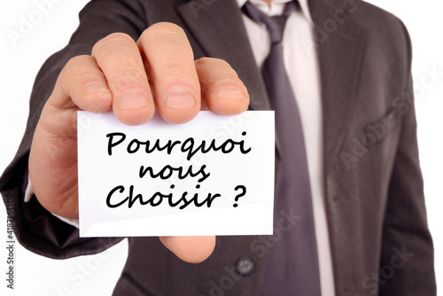 Homme tenant une carte sur laquelle est écrit pourquoi nous choisir