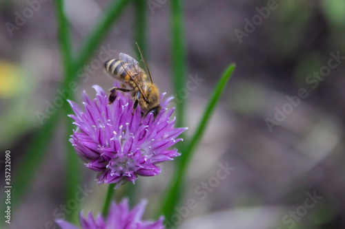 Honey bee apis mellifera on Flower head of Garlic (Allium sativum) while collecting pollen