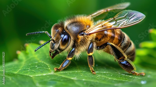 bee, insect, leaf, nature, macro, wing, green, yellow, black, brown, wildlife, fauna, photo, honey, close, up, animal, pollination, garden, outdoors, bug, insect, closeup, small, detail, body, leg, antennae, eye, hair, furry, striped, pattern, natural, biology, zoology, flora, environment, plant