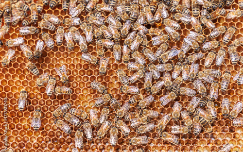 Honey Bees working on honeycomb close-up shot.