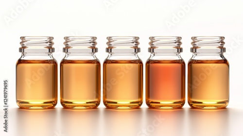honey glass jars in a row, warm earthy colors, liquid honey texture, detailed glass reflections, isolated on white background