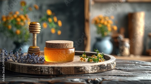 Honey jar with wooden dipper on rustic tray