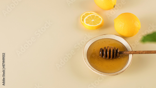 Honey with fresh lemons and fresh mint leaves on beige. Copy space