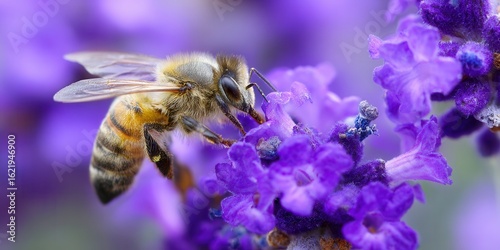Honeybee collecting nectar from vibrant purple lavender flower in close-up macro detail