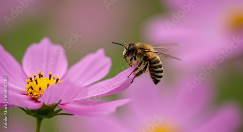 bee, honey bee, insect, flower, cosmos, pink, nature, closeup, macro, detail, pollen, wing, striped, delicate, vibrant, beauty, garden, summer, flying, pollination, wildlife, natural, closeup, blossom, yellow, gold, insect, floral, photo, apiculture, pollinator, environment, organic, gardening, flora, fauna