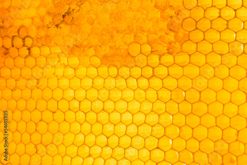 Honeycomb close up background. Natural honey in honeycomb wallpaper. Beekeeping concept. Cells of a frame partially filled with honey
