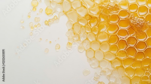 Honeycomb texture with golden honey dripping on white background.
