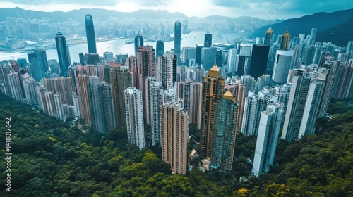 Hong Kong cityscape from above, dense urban sprawl, towering buildings amidst lush greenery