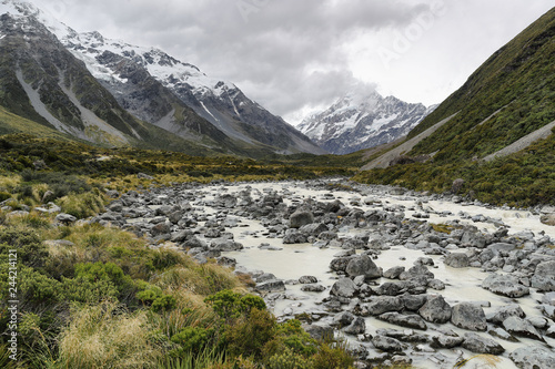 Hooker Valley Track hiking trail, New Zealand. River leading to Hooker lake with glacier over view of Aoraki Mount Cook National Park with snow capped mountains landscape.