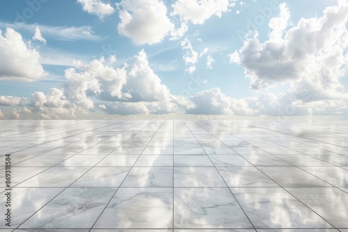 Horizon landscape scene with an empty floor and a beautiful blue cloudy sky background.