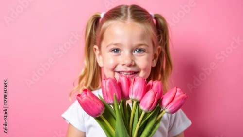 horizontal banner, portrait of a smiling little girl with long blonde hair, holding a bouquet of pink tulips, mother's day, pink background