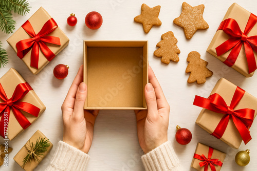 christmas, gift, box, empty, holiday, present, festive, gingerbread, cookie, wrapping, decoration, winter, background, topview, hand, cosy, red, gold, celebration, pine, ornament, christmas, creative, concept, open, holiday season, home, cardboard box, design, christmas background, wrapping paper, lifestyle, minimalist, christmas, cheerful, modern, warm light, seasonal, aesthetic, greeting, giving, hand