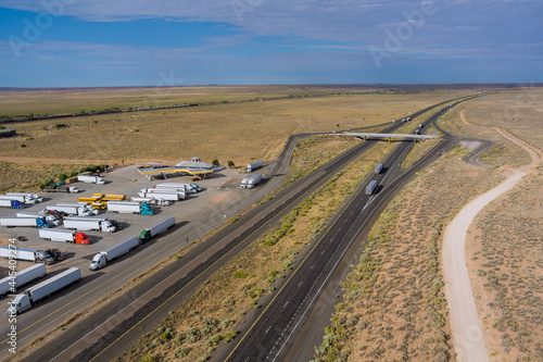 Horizontal panorama trucks stop on rest area near Interstate highway in desert Arizona