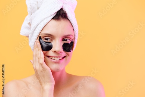 Horizontal photo, a woman with perfect skin on an orange background in a towel on her head and body with black patches on her face and even teeth smiles fervently