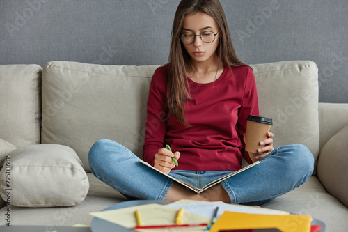 Horizontal shot of attractive brunette young woman writes plan for project, sits crossed legs on sofa, tries to concentrate on work, drinks takeaway coffee, wears casual red sweater and jeans.