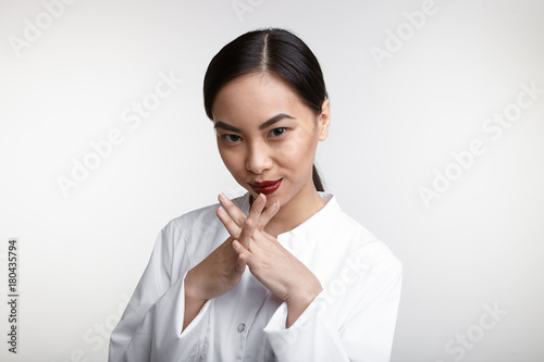Horizontal shot of attractive successful young Korean woman plastic surgeon with bright make up looking at camera and smiling mysteriously, clasping her hands, ready to see her next patient