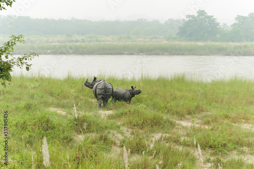 Horned Great Indian Rhinoceros and her cub in Chitwan National Park, Nepal