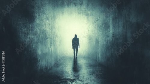 Horror, A solitary figure walks towards a bright light at the end of a dark, misty corridor, evoking feelings of mystery and introspection.