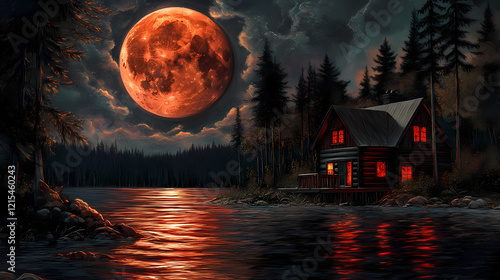Horror haven in the woods: dark shadows, eerie whispers, blood-red moon, isolated cabin, suspenseful. Crimson Harbor. Illustration