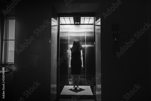 Horror photo of woman in the lift in wihte tone