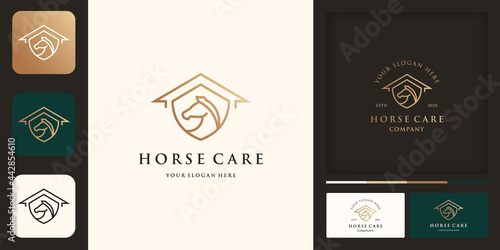 horse care logo, horse farm, shield house and business card